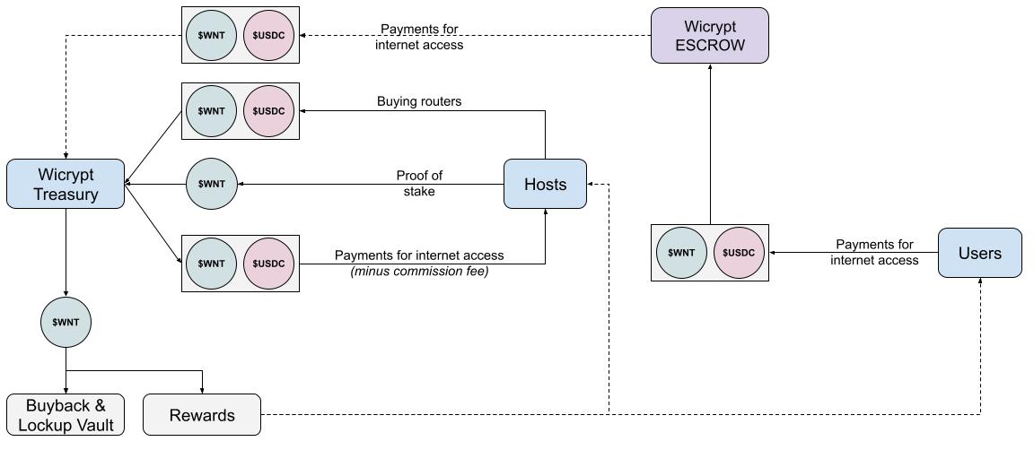 Please refer to the chart below, summarizing Wicrypt token circulation and ecosystem participants interactions: